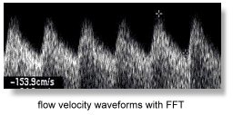 With Fast Fourier Transform, mean flow velocity, pulsatility index, and other diagnostic parameters can be displayed and measured. By comparing established typical values with actual examination results, the interpreter can make determinations about vessel hemodynamics. For example, stenoses and occlusions may cause elevated velocity levels. Mean velocity is representative of, but does not directly measure, blood flow in the vessel. Pulsatility index describes the shape of the waveform and the relationship between peak systole and end diastole. It is believed to represent, primarily, an estimation of downstream vascular resistance. Resistance Index provides another measure of downstream vascular resistance.